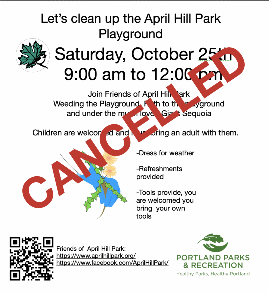 The playground cleanup event scheduled for Saturday, October 25th, 9:00 am – 12:00 pm is canceled because of weather predictions of heavy rain, thundershowers and wind gusts over 25 mph.